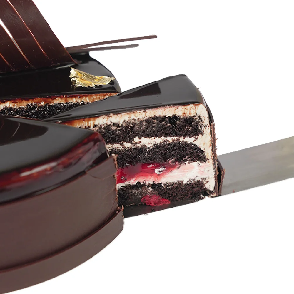 Deep cocoa flavors balanced by fresh cream and tart fruit. A luxurious chocolate cake filled with a generous cherry reduction and finished with a dark chocolate glaze.