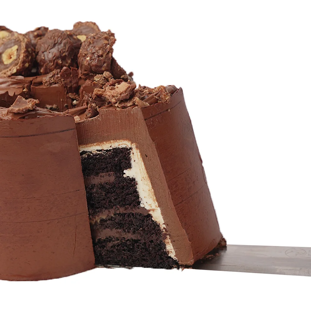 A modern work of edible art. Smooth milk chocolate cake accented with floating gold flakes and a dynamic topping of crushed hazelnuts and chocolate confections.