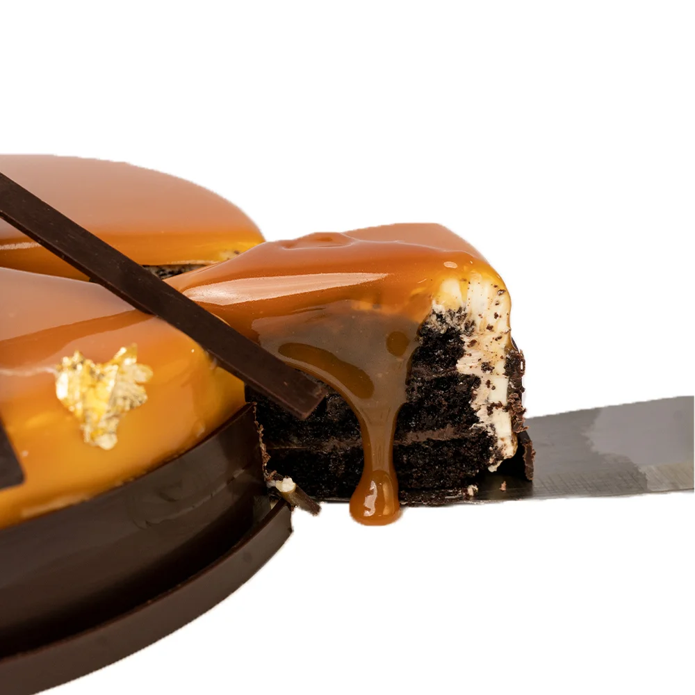 A decadent layers of rich chocolate cake with luscious caramel sauce, topped with a sprinkle of sea salt.